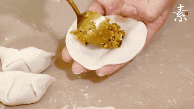 4.餃子皮放上餡,按自己習慣的手法包成餃子。