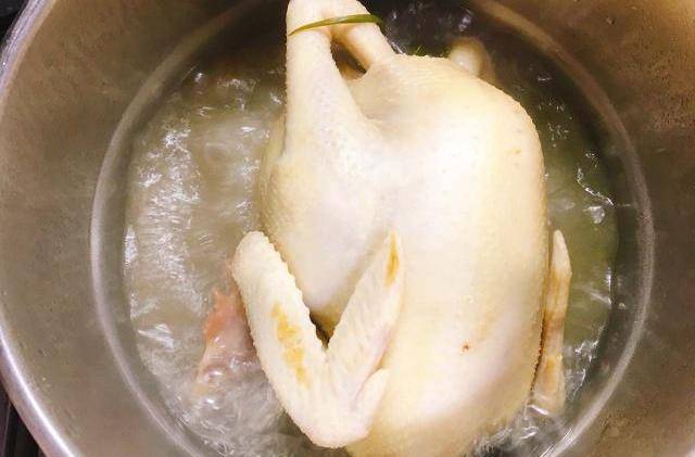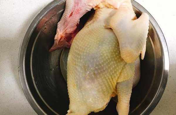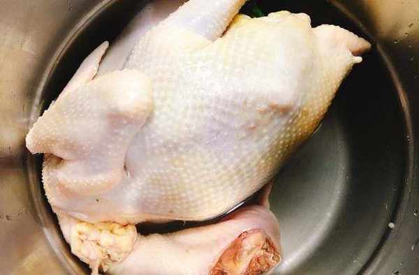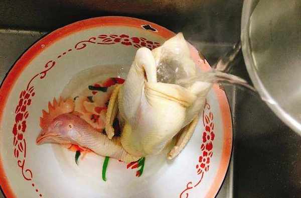 2、燒一鍋熱水,等水燒開之後把清洗幹凈的整隻雞用開水沖下,這樣一來能讓肚子裡的血水沖洗幹凈,二來能讓雞皮被燙熟,然後在用涼水沖洗下,這樣會讓雞皮回頭會更脆更好吃;