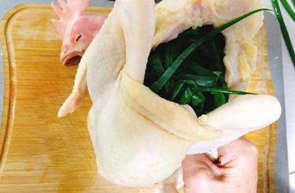 4、然後把雞的兩隻腳給塞到雞肚子裡,接著再把生薑片,蒜頭和洗幹凈的蔥一起都塞到雞肚子裡;