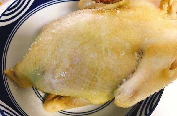 8、燜好之後就可以把雞給撈出來涼,到這一步大傢是不是註意到,這個和白切雞的做法幾乎是一模一樣的,隻是我這個雞煮的比較久,因為是老母雞,不過雞肉煮好之後撈出來,老婆給雞身上均勻的抹瞭點鹽,這個可是白切雞裡沒有做的,這一步抹鹽讓雞肉吸收點鹽的味道,感覺特別的香,特別的有味道,都能和鹽焗雞媲美瞭;