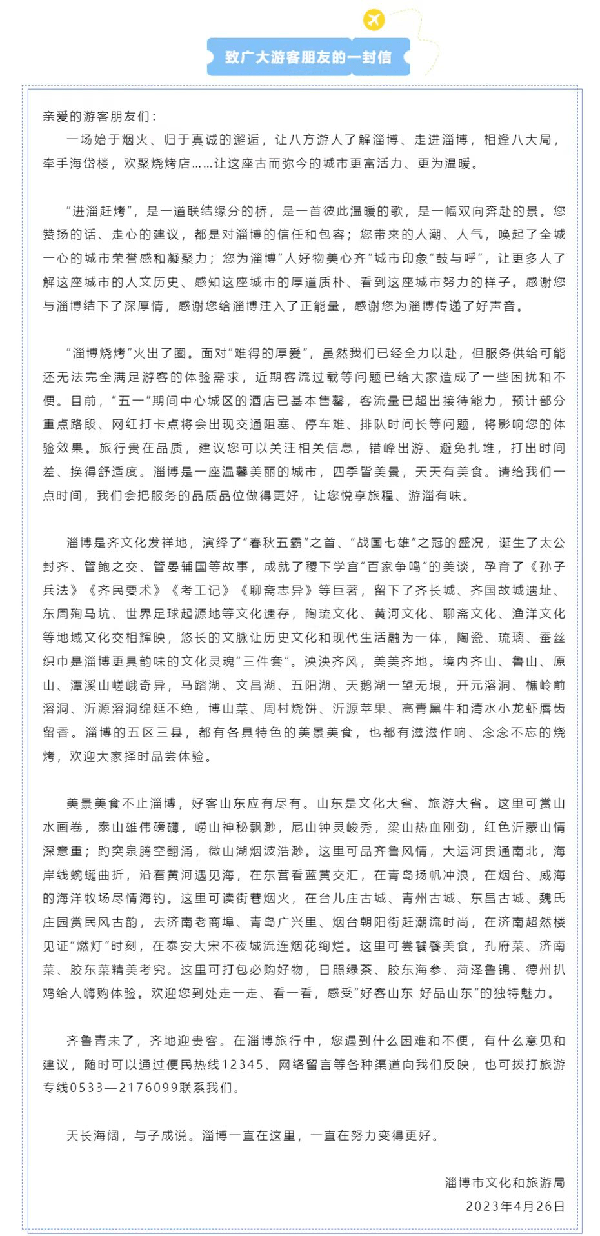 同時,為瞭以防不備,淄博也發瞭一封“勸退信”,不過,這封信不是在“真勸退”或“凡爾賽”。其在信中表示:淄博四季皆美景,可別紮堆五一時;淄博美食天天有,錯峰來吃也一樣。這時候不來淄博,也是一種溫柔。