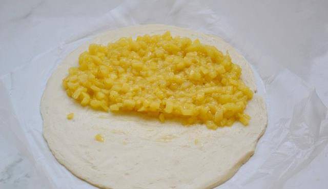 3、手抓餅一分為二,取其中一半的手抓餅,放入適量的蘋果丁。