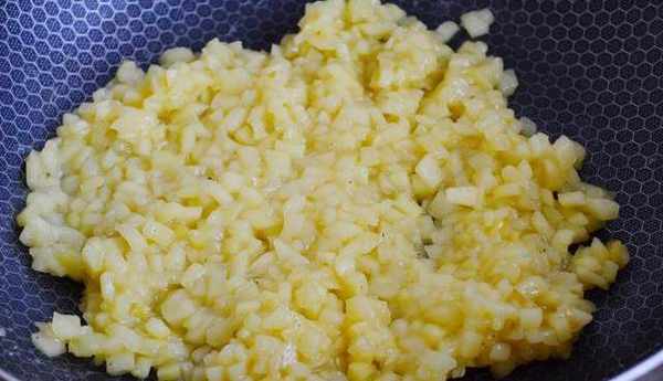 2、鍋燒熱,倒入蘋果丁下入鍋中翻炒至軟爛後在加入細砂糖攪拌均勻成為餡料備好。