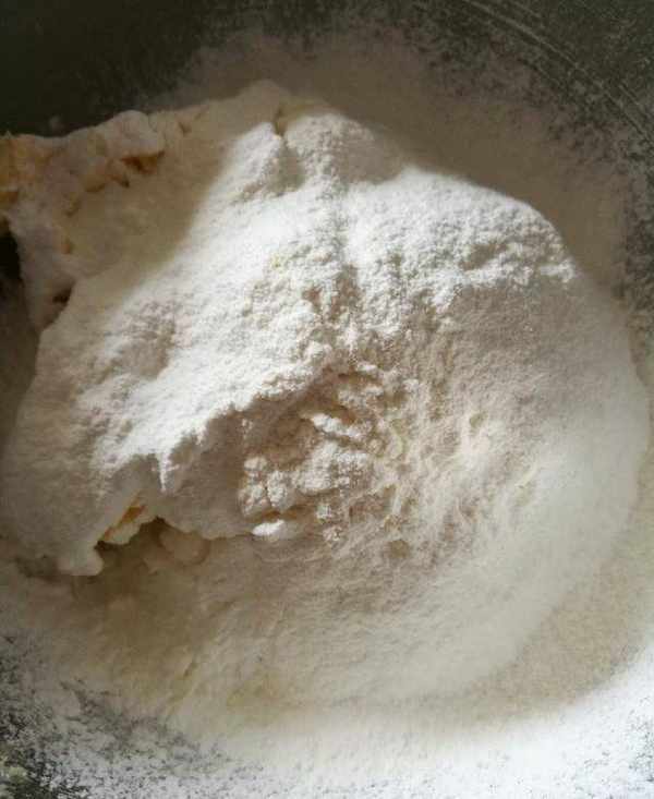 4、低粉和淀粉混合後,篩入黃油糊裡,用刮刀拌勻。