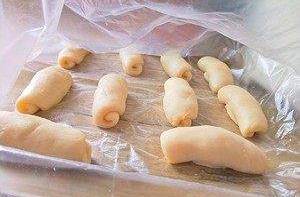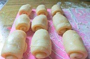 將步驟3的粉卷兒用搟面杖搟成牛舌狀,正面卷起,蓋膜靜置15min