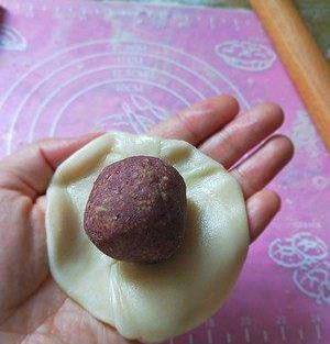 將油皮分成10等份,此時也將油酥材料混合分成10等份,油皮和油酥一起蓋膜靜置15min。(把餡料也分成10等份)