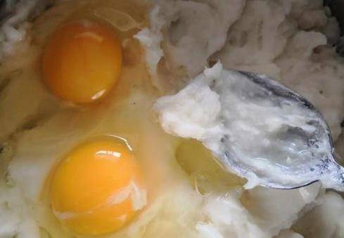 蒸熟的山藥倒入到盆裡邊稍微晾涼,然後用勺子壓成山藥泥。接著打入兩個雞蛋,加入酵母三克,白砂糖15克,用勺子攪拌均勻。攪拌均勻以後,放入300克面粉揉成光滑的面團。面團和好瞭以後不用讓面團發酵,直接放到案板上面,把面團搟成厚度為一厘米左右的餅,找一個圓形的工具,扣出一個圓形小餅。