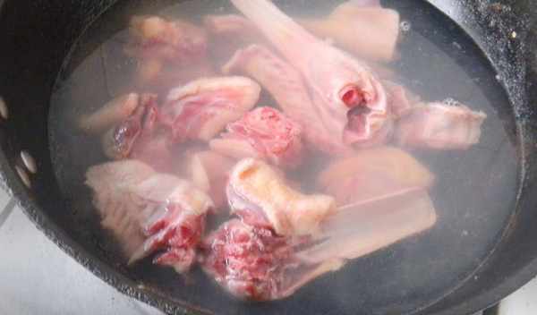做這個湯我選用的是老鴨,將老鴨斬塊放入冷水鍋中煮開洗凈