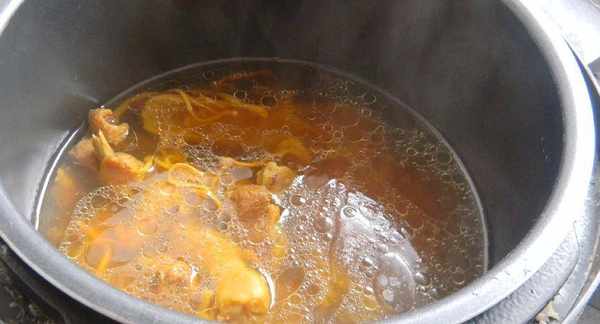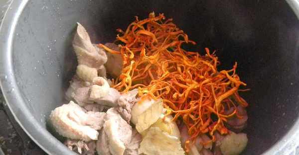 這個就是蟲草花瞭,另外我放瞭一小片的當歸,還有香葉和薑片去腥
