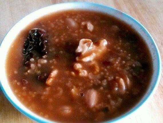 3、大火煮沸後改小火煮,至靈芝、核桃仁、花生米熟爛粥稠,加紅糖調味。