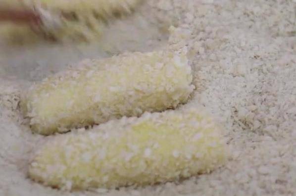 我們再加入兩勺玉米淀粉給它攪和均勻,攪拌成這種特別濃稠的狀態就可以瞭,我們準備一個盤子裡面倒瞭100克的面包糠,再把山藥放裡面,給它裹上面包糠,把它放在盤中備用。鍋中熱倒一升食用油。油溫五成熱,把山藥給下油炸。