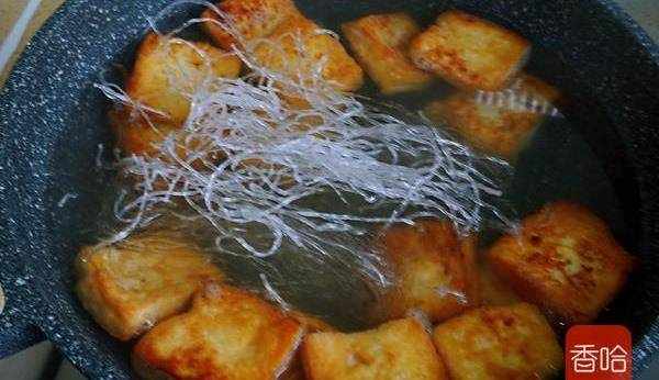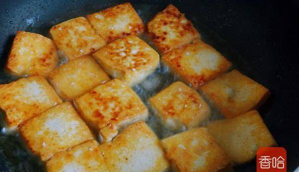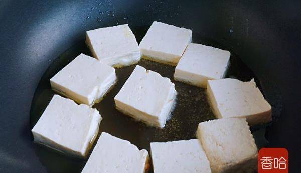 3.豆腐切成小方塊,油熱入鍋,中小火煎制