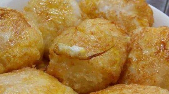 平底鍋燒熱之後刷上一層食用油,然後將準備好的每一個小圓球放進平底鍋當中,一直煎至兩面煎黃。