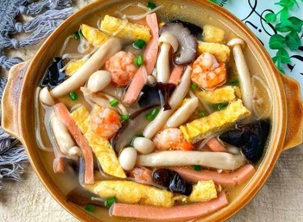 3.另起鍋燒油,油熱以後把蔥薑蒜倒進鍋裡面,煸炒出香味後把切好的火腿條和木耳倒進鍋中翻炒,翻炒兩分鐘後把焯過水的所有菌菇倒進鍋裡繼續翻炒兩分鐘,然後加入適量清水煮沸,煮沸後把蝦仁和煎過的雞蛋條一起倒進鍋裡,再次煮沸後撒上食鹽調味就可以盛出裝盤瞭,最後撒上蔥花裝飾即可。