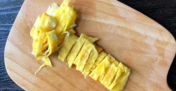 2.鍋中燒油,油熱後把雞蛋液倒進鍋中,一面煎至金黃定型後翻面,煎至兩面金黃後盛出,放在案板上切成長條。鍋中加入清水,把大蝦和切好的菌菇倒進鍋裡,焯水兩分鐘左右撈出備用。