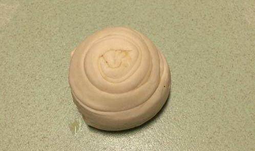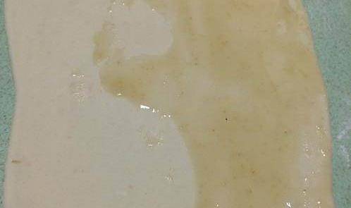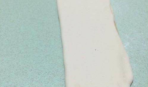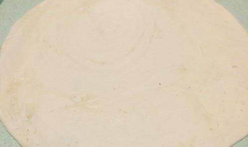 取一個劑子揉幾下後搟成牛舌狀,盡量搟薄一點,之後把油酥糊抹在面餅一半