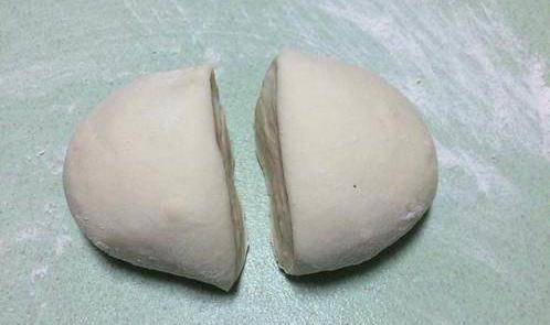 一切準備好之後,面團取出進行揉面排氣,揉至光滑後分成兩個劑子