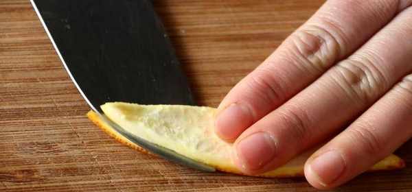 用刀片掉橙子皮內部的黃色部分,盡量片薄一點,把黃色部分多片掉一點。