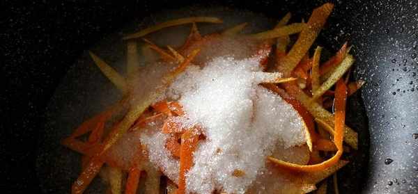 鍋內倒水,下橙子皮,加適量的白砂糖,攪拌均勻。