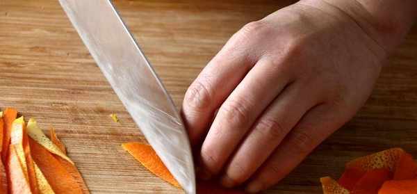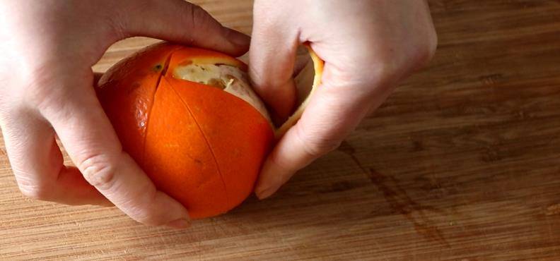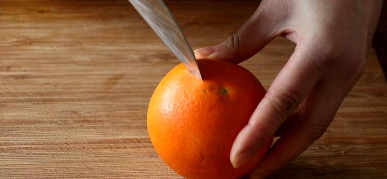 用刀在橙子表皮上劃上幾刀,取下橙子肉。
