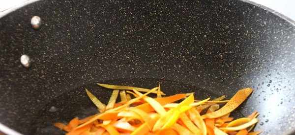 炒到糖水開始起砂就可以關火瞭,關火以後還是要繼續炒,直到橙子皮炒變幹,變硬,糖也變成硬硬的即可。