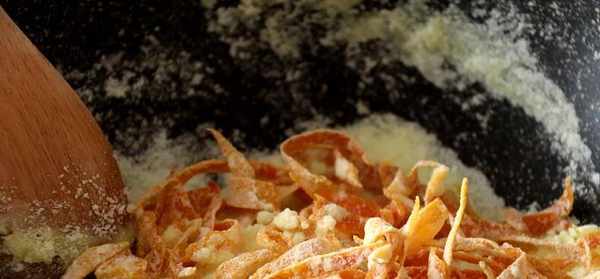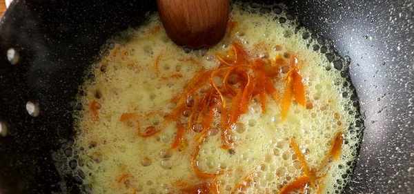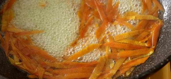 等炒至糖水變色,有點微微發白。(因為橙皮是橙色的,煮過以後糖水也會有點變黃,這個是正常現象。)
