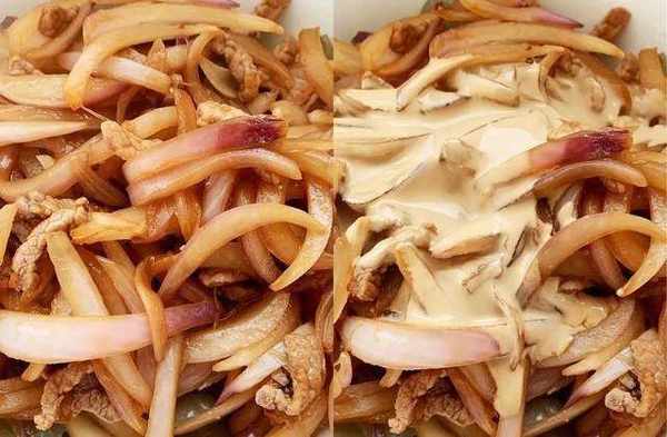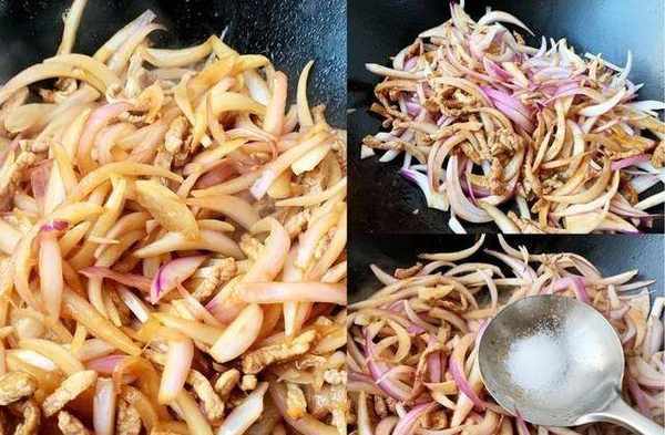 2、洋蔥炒肉絲鹽要比正常炒菜多放一點,因為拉皮、芝麻醬等沒有咸味,如果鹽放少瞭,整個菜的滋味偏淡瞭。