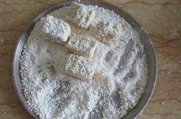 (3)之後把每一塊豆腐都沾上紅薯粉;