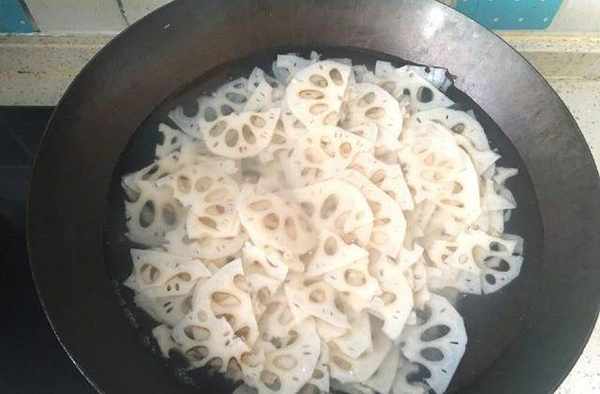 2.蓮藕先用清水洗掉表面的淤泥,然後用刀子去皮,切成薄薄的藕片,放入涼水中清洗幾遍,鍋中燒水,水開後把藕片倒進去焯三分鐘