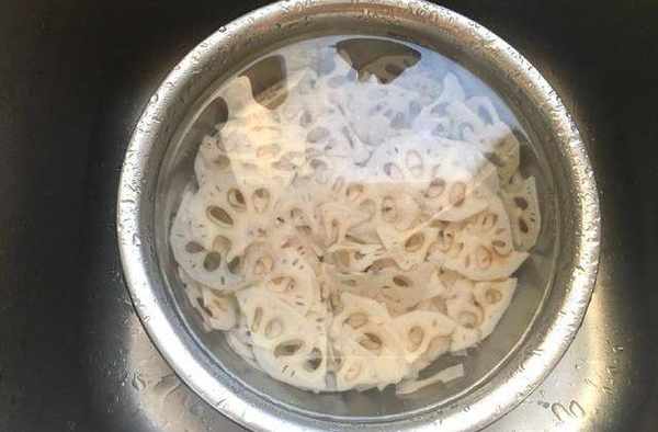 3.提前準備一個盆子,裡面裝滿涼水,藕片焯水後用漏勺撈出來迅速倒入涼水盆中,這樣做的目的是為瞭讓藕片更脆更有口感