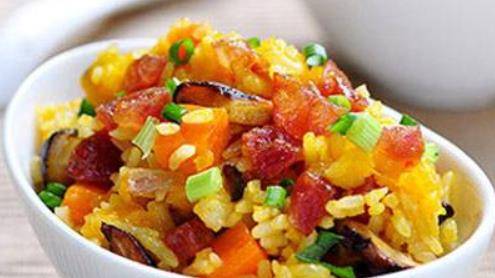我們準備這樣的糯米,將糯米淘洗兩遍之後用清水浸泡,一般情況下,第2天做糯米飯,頭天晚上就會把糯米浸泡起來,這樣第2天做不耽誤事,將浸泡好的糯米放入電飯鍋裡面煮熟,糯米和南瓜都處理好瞭之後,我們將臘肉切成丁,胡蘿卜也切成丁,再準備青豆等一些配菜,其實這裡面的配菜也大傢也可以根據自己的喜歡來添加。