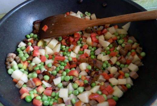 配菜都處理好瞭之後,鍋中放入少許的油,先把臘肉炒熟,然後再放入胡蘿卜丁,煮好的青豆,接著再放入糯米,翻炒均勻之後再加入少許的黑胡椒粉,鹽,花椒油,翻炒均勻入味,然後將炒好的糯米飯放入到南瓜裡面,上鍋蒸至南瓜軟糯就可以瞭。在做南瓜糯米飯時,別隻會做甜的,加入臘肉和胡蘿卜做成咸的,可好吃瞭,一頓3碗不過癮!