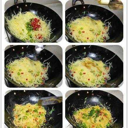 6.起鍋,倒入適量植物油,油溫燒至6成熱,放入控幹水分的土豆絲,大火爆炒。