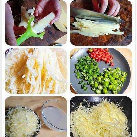 溫馨貼士:土豆絲想要切好不容易,所以就用瞭這個小妙招,土豆皮的厚度幾乎是一樣的,這樣你在切的時候,也好控制寬度,就比較容易切,哪怕刀工不好也沒關系。切好的土豆絲,要在清水裡泡一會,最好是多換幾次水,泡出裡面的淀粉,炒土豆絲不爽脆,就是因為裡面的淀粉。所以想吃脆脆的土豆絲,這一步一定不能省下。炒土豆絲的時候,要大火爆炒,速度要快一點,不能炒時間長,越快越好。