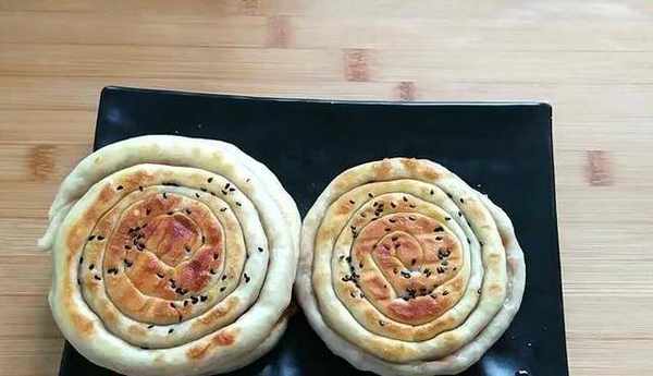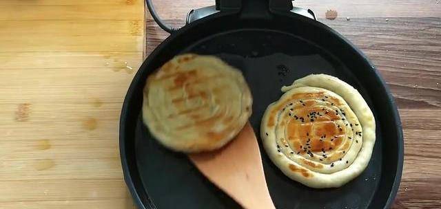 起鍋預熱,開中小火,刷上一層油,放入餅坯,在餅皮上面也刷上一層油。撒上一層黑芝麻。蓋上蓋悶兩分鐘左右,給他翻個面,煎至兩面金黃就可以出鍋瞭。