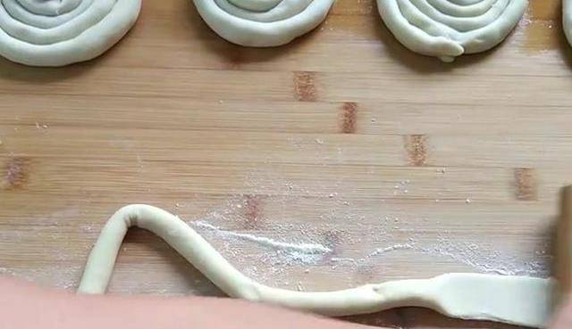 醒好的面團不用揉,直接搓成長條,分成5個大小相同的劑子,再把劑子搓成長條。一段一段的搟成長條面片,擠上準備好的肉餡,像這樣對折封口,全部封口之後,把封口處朝下慢慢卷起來。把尾端和頂端捏合。