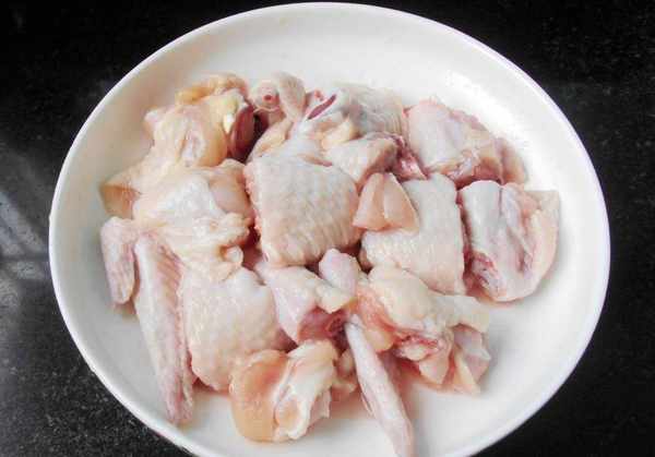 3.把雞翅洗幹凈,切小塊,放少許的鹽,料酒放一勺醃制5分鐘。