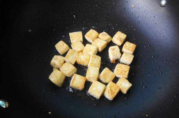 4.把豆腐切小塊,鍋中放適量的油煎至兩面金黃