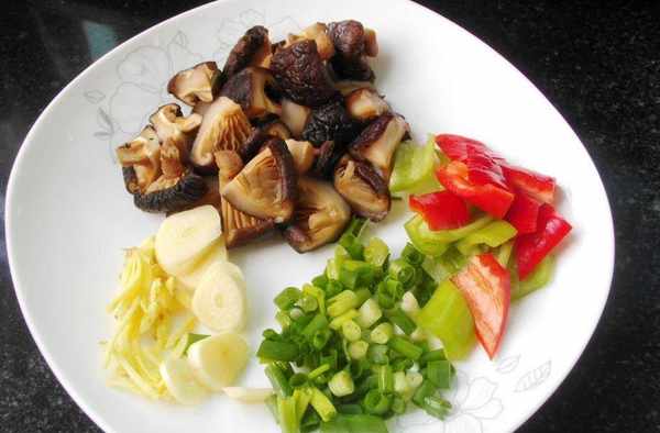 5.把泡發的香菇用手擠出水份切小塊,把青椒和紅椒切片,大蒜拍碎,蔥切碎,薑切絲