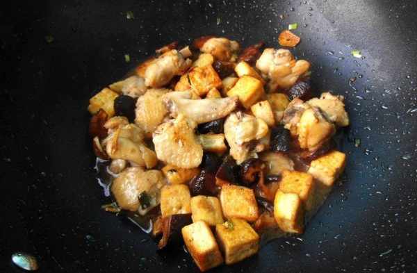 8.把煎好的豆腐放入和雞翅一勺翻炒後, 準備調味,放入醬油、鹽,白糖,料酒適量,加小半碗水攪拌一下,蓋上蓋子燜煮一會兒