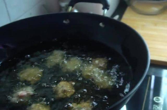 加入適量的玉米淀粉,淀粉也不要放得太多,可能成團就可以瞭。油溫七八成熱的時候再倒著彎子復雜一遍。好,丸子炸至金黃色就可以出鍋瞭。這樣炸出的丸子外皮酥脆,內裡鮮嫩。剛剛聽他的丸子就做好瞭,可以用來做肉丸湯,也可以直接拿來吃,都很不錯的。