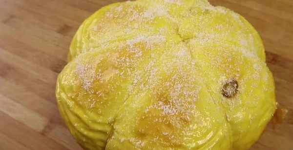 刷上一層蛋黃液,最後蓋上耐高溫的保鮮膜,等水上鍋大火燒開水,開以後轉中火蒸40分鐘,時間到關火悶5分鐘再開蓋上下水蒸氣,再刷上一層蜂蜜,最後撒上椰蓉就可以開吃瞭。