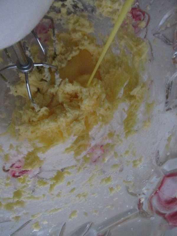 3,把雞蛋打勻成蛋液,分次加入到黃油中,每一次都打勻後再加入下一次。