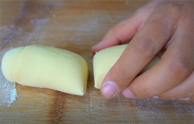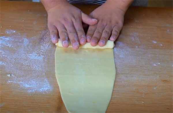 4.取出來一個面劑揉一下,在掌心團圓按扁,搟成牛舌狀,從底部卷起來。