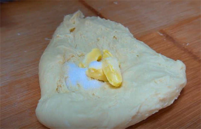1.準備340g的高筋面粉,再加入70g的低筋粉,5g的酵母粉,70g白砂糖,然後用160毫升的溫牛奶來和面,按照洗衣服的方式去揉面,揉到表面光滑的時候,咱們再加入20g的黃油,5g的食用鹽。