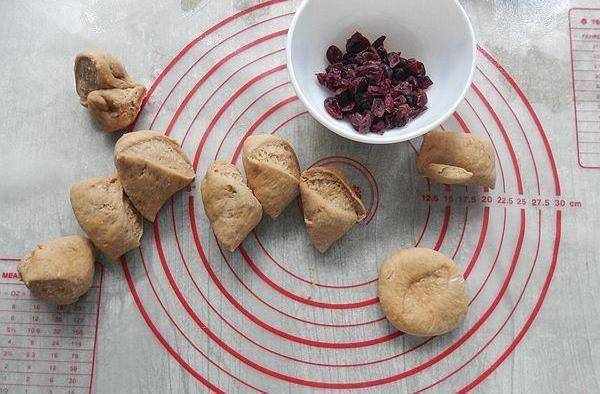3、面團發好之後需要再揉搓至光滑,這一步叫排氣。分劑子。把小面團按扁,包入適量蔓越幹,收口,壓扁,做成小餅。是不是很簡單呢?
