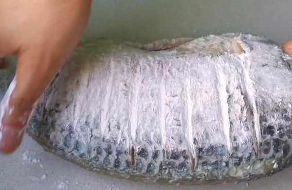 然後把魚全身都抹上一層淀粉,換一面再塗抹均勻。