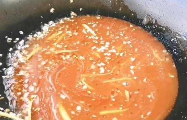 瀝幹油,放盤子裡,再起鍋燒油,放入薑絲,蒜末炒香,然後倒入調好的糖醋汁。