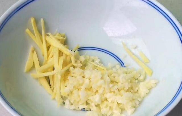 空閑時間切一些薑絲和蒜末,全部切好以後,放碗裡備用。空閑時間我們把薑絲拿掉,