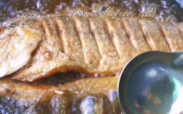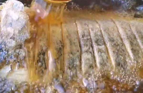 油放少瞭,不能全部淹沒魚,就用勺子把油往魚身上澆,使它受熱均勻一些。邊澆邊用中火慢慢的炸,再把它推動一下,防止底部糊瞭,